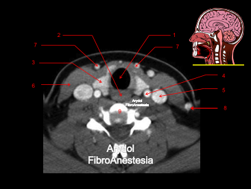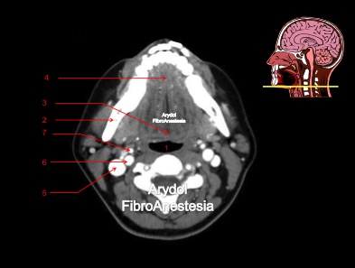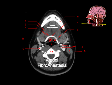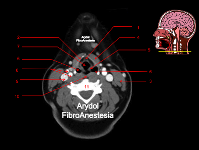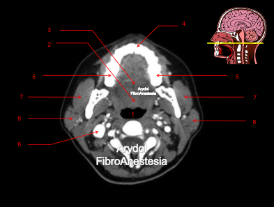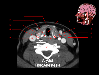 1.mandíbula; 2.borde libre de la epíglotis; 3. vallécula derecha; 4.glándula submaxilar; 5.arteria carótida bifurcada (interna y externa); 6.vena yugular interna; 7.cuerpo vertebral; 8.músculo esternocleidomastoideo; 9.músculos suelo de la boca