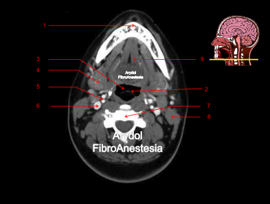 1.orofaringe; 2.mandíbula; 3.base de la lengua; 4.suelo de la boca; 5.vena yugular interna; 6.arteria carótida interna; 7.arteria carótida externa
