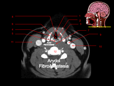 1.Hueso hioides; 2.vallécula derecha; 3.vallécula izquierda; 4.luz laríngea; 5.epíglotis; 6.mandíbula; 7.ligamento glosoepiglótico medial; 8.arterias carótidas interna y externa; 9.músculo esternocleidomastoideo; 10.vena yugular interna; 11.glándula submaxilar; 12.vertebra.
