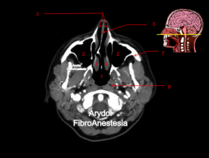 1.nasofaringe (cavum); 2. senos maxilares; 3. tabique nasal; 4. corenetes; 5.vía aérea fosas nasales; 6. trompa de Eustaquio; 7. rama mandibular