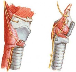 - Rama externa motora: inerva el musculo cricotiroideo (tensor de las cuerdas vocales). El resto de la musculatura intrínseca laringea está inervada por el n.laringeo recurrente. El estímulo del n.laringeo superior es el que provoca el laringoespasmo.