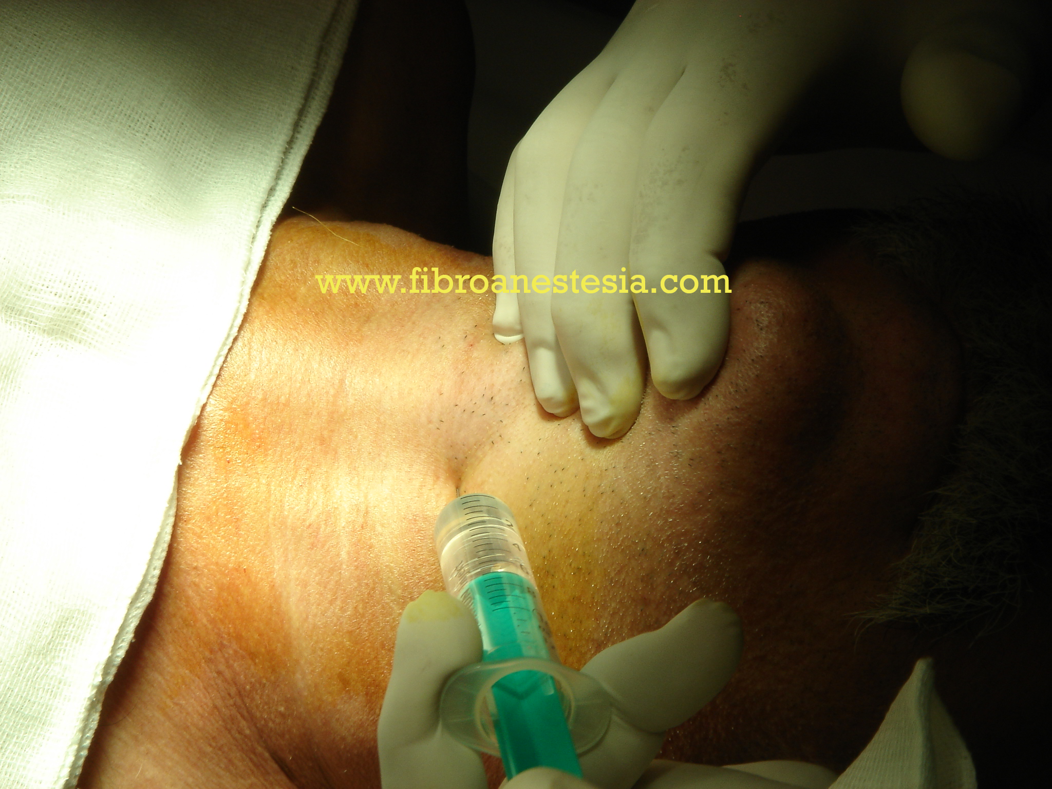 - Lateral: Con esta vía de acceso pretendemos anestesiar las ramas sensitivas del n.laringeo superior localizadas a nivel de la grasa preepiglótica. Trazaremos una línea horizontal por la superficie superior del tiroides y a unos dos centímetros del final de las astas del tiroides en posición paralela a la linea trazada avanzamos la punta de la aguja en dirección medial 1-1’5 cm, existe riesgo de puncionar las cuerdas vocales.