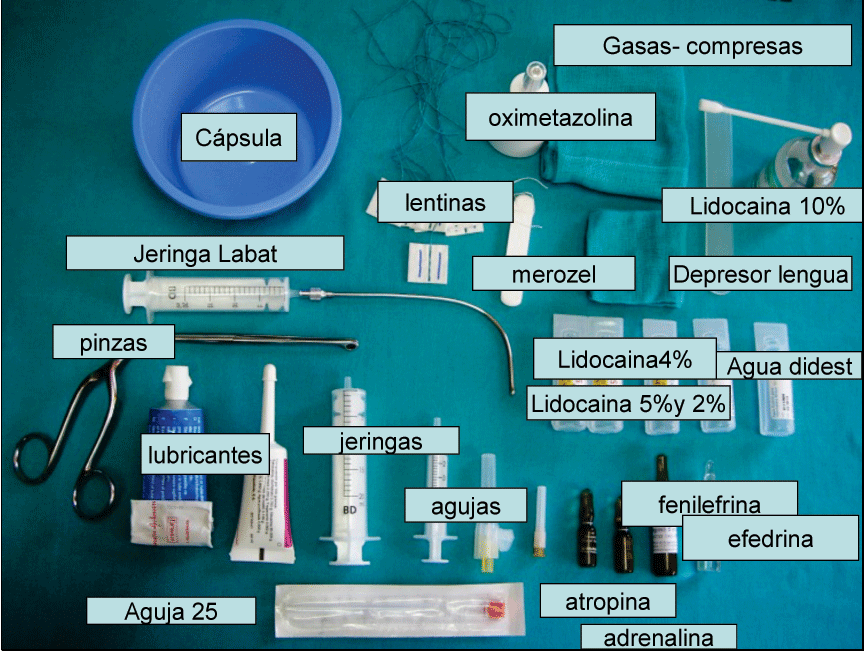 Capsula. Lentinas. Merozel. Oximetazolina.Compresa.Depresor de lengua. Spray lidocaina 10%.Jerina de Labat. Lidocaina2%. Lidocaina 5.Agua destilada. Pinzas de Magill pequeñas. Lubricante hidrosoluble. Lubricante liposoluble. Jeringas de 10 y 20 ml. Aguja de cargar. Aguja de insulina. Atropina .Adrenalina. Fenilefrina. Aguja espinal 25 G.