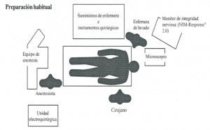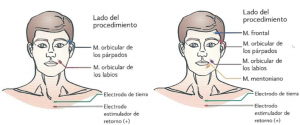 Para la monitorización intraoperatoria del nervio facial se colocan los electrodos en músculos inervados por este nervio. En los procedimientos de base de cráneo e intratemporales se monitorizan los músculos orbicular de los párpados y orbicular de los labios. En los procedimientos extratemporales se añaden los músculos frontal y mentoniano.