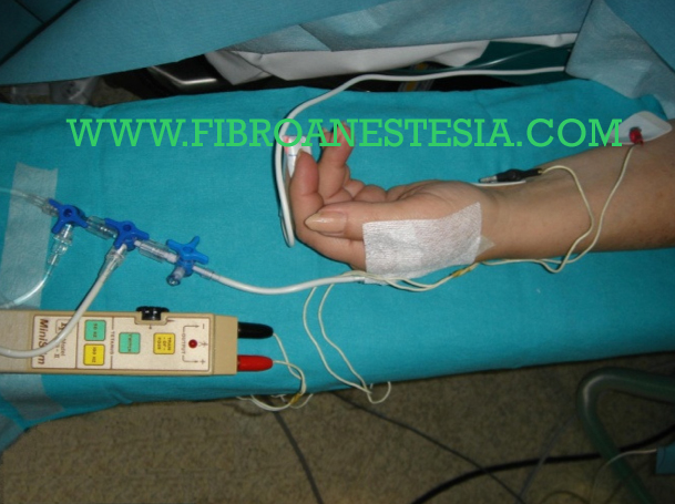 Se canaliza una vena del dorso de la mano . La perfusión se realiza con una bomba Hot Line Fluid Warmed. Carefusion. U.K. A continuación se coloca al paciente mascarilla facial conectada a un sistema de Mapleson D con 5 litros de O2 de entrada alcanzándose la desnitrogenación ( Sat 92 % en gas espirado) en tres minutos.