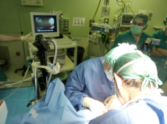 Se posicionó videoscopio flexible por vía nasal para visualización directa y continua de las cuerdas vocales mediante técnica spray as you go7, sin incidencias. Una vez conseguido el plano de correcta visualización de cuerdas vocales se deja el videoscopio suspendido en soporte de sujeción durante toda la intervención, permitiendo visión de imagen de cuerdas vocales con pequeños movimientos de corrección de posición, mediante monitor por parte de otorrinolaringologos.