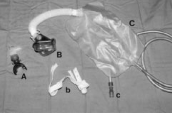 Sistema NasOral: A:mordedor bucal con línea de espirometría; B: Pieza nasal; b: arnés de fijación para pieza nasal; C:bolsa reservorio de 3'5l; c:linea de conexión de oxígeno