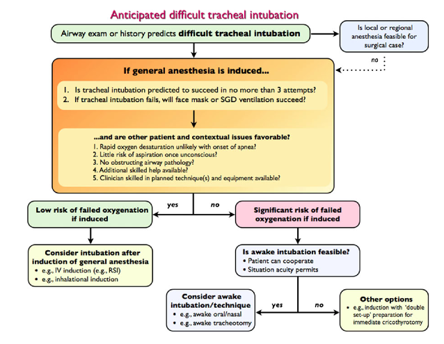 En conclusión, para el caso de un paciente con intubación traqueal difícil anticipada, una aproximación post-inducción anestésica puede considerarse si: se prevee el éxito de la intubación con la(s) técnica(s) seleccionada(s) en el curso de tres (3) intentos, se prevee el éxito en la oxigenación a través de mascarilla facial o laríngea, y el resto de situaciones del contexto del paciente son favorables. De lo contrario, hay un alto riesgo de perder el control sobre la oxigenación y la aproximación con el paciente despierto será la más prudente.