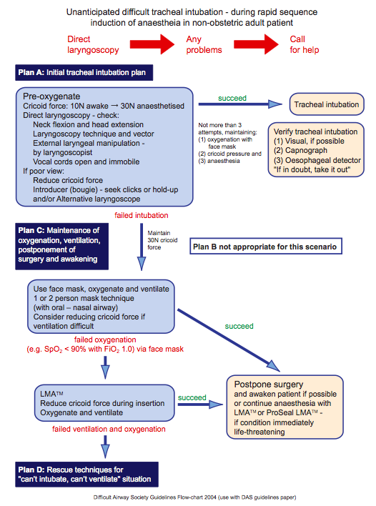 El algoritmo de la DAS se basa en una serie de planes de actuación. El manejo efectivo de la vía aérea, requiere planear de forma cuidadosa la forma de actuar, de manera que se pueda utilizar una serie de planes alternativos (plan B,C,D), cuando la técnica inicial (Plan A) falla.