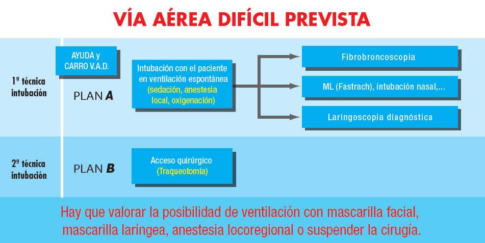 Si no se ha conseguido intubar la tráquea, a partir de este momento se debe pedir AYUDA INMEDIATA y el CARRO DE VAD, si no se había hecho previamente, y decidir la estrategia: Si la ventilación con mascarilla y la oxigenación son correctas: pasar a PLAN B. Si la ventilación es difícil o la oxigenación empeora: pasar a PLAN C. Si la ventilación ya no es posible: pasar a PLAN D.