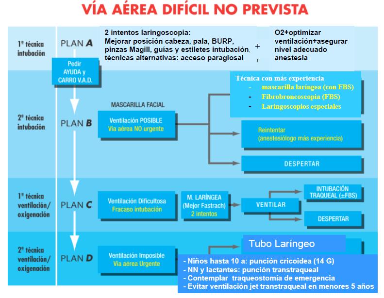 Si no se consigue intubar al 2ºintento, se debe pedir ayuda inmediata y el carro de VAD, si no se había hecho previamente. A partir de aquí se decide la estrategia: si la ventilación con mascarilla facial y la oxigenación son correctas, se pasa al plan B. Si la ventilación es difícil o la oxigenación empeora, al plan C; si la ventilación no es posible pasar al plan D.