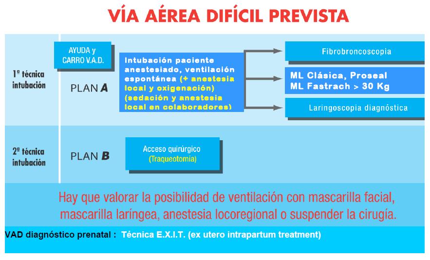 En el algoritmo de la VAD prevista se incluye el manejo de la VAD de diagnóstico prenatal: malformaciones congénitas de la vía aérea (teratomas o linfangiomas orofaríngeos o cervicales, etc). Si existe riesgo de obstrucción de la vía aérea al nacer (polihidramnios materno, tamaño grande de la masa) se puede plantear el abordaje intraparto mediante la técnica EXIT (exutero intrapartum treatment), tras valorar los posibles riesgos maternos. En el momento del parto mediante cesárea, y mientras el feto está aún con vascularización placentaria, se asegura la vía aérea mediante intubación con laringoscopia convencional, fibrobroncoscopio o traqueostomía (o bien se soluciona la oclusión). Una vez asegurada la vía aérea se clampa el cordón umbilical y se finaliza el parto.