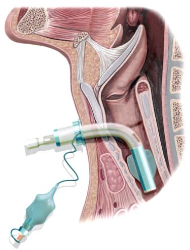 Tras elegir el anillo nos disponemos a dar un punto en U horizontal con sutura reabsorbible (Vicryl 2-0 aguja pequeña) sobre el anillo traqueal elegido que nos aportara tracción de la pestaña traqueal y facilitara la canulacion (Colgajo de Björk). Previamente habremos pedido que desinflen el balón del IOT para evitar pincharlo y que lo vuelvan a hinchar tras el punto. Antes de abrir vía aérea tener cerca la cánula, la tijera y el bisturí, ya que una vez abierta la vía aérea no podremos perder tiempo en buscarlos. Con bisturí del 11 y tras deshinchar de nuevo el balón realizaremos una incisión horizontal “amplia”, sobre la membranosa superior al cartílago elegido. El aire y las secreciones comenzaran a salir de la vía aérea y el respirador pitara anunciando fuga aérea. No hay que ponerse nervioso ya que el paciente sigue ventilado y tenemos un margen muy amplio de tiempo sin que el paciente se desature. Con tijera cortaremos el cartílago a ambos lados mientras traccionamos del punto. Pediremos que retiren progresivamente, nunca de una vez (si no somos capaces de canular el anestesista puede progresar de nuevo el tubo), el tubo orotraqueal y canularemos al paciente una vez tengamos libre la vía aérea. Hinchar el balón de neumotaponamiento de la canula y conectar el respirador. Comprobar adecuado funcionamiento. Se pueden poner dos gasas compresivas a modo de hemostático en ambos lados. Fijar la traqueo siempre después de quitar la hiperextension ya que si no puede quedar floja.