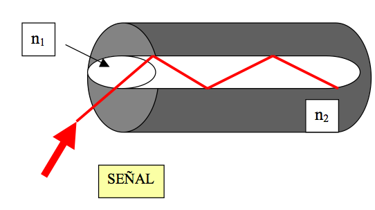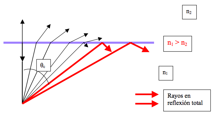 EL rayo de luz que se propaga en un medio con índice de refracción n1 que incide con un ángulo θ1 con una superficie sobre un medio de índice n2 donde n1 > n2 puede reflejarse totalmente en el interior del medio de mayor índice de refracción. Esta reflexión interna total se produce para ángulos de incidencia θ1 mayores que un valor crítico