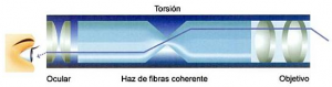 - Haz de fibras luminoso: Es un haz incoherente, sin acomodo espacial, con fibras ópticas más baratas de construir y que únicamente transmiten la luz hasta la punta del fibroscopio