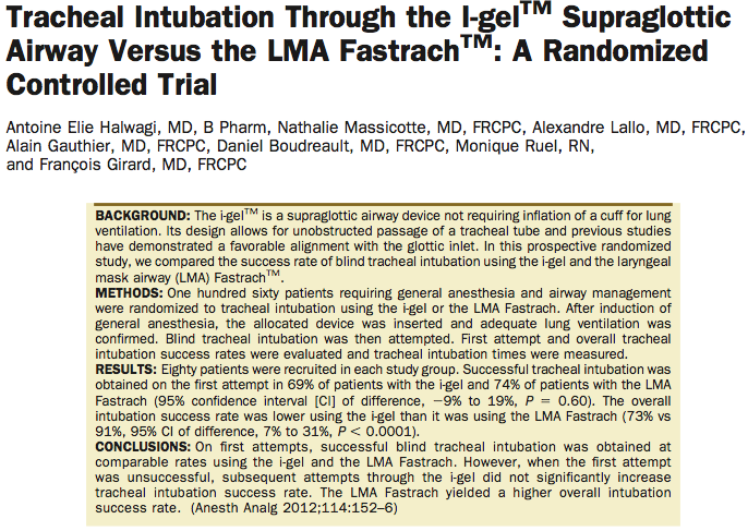 - Se comparan la proporción de exitos de intubación a ciegas al primer intento a través de la mascarilla laringea I-gel y la mascarilla Fastrach y el porcentaje de intubación conseguida final a través de ambos dispositivos. Para ello se reclutaron un total de 160 pacientes, 80 para cada dispositivo y tras lograr una ventilación adecuada a través de los mismos (el numero de mascarilla se eligió según criterios de peso) se intento la intubación traqueal a ciegas (tubo endotraqueal 7 en mayores de 50 kg y del 6 en menores de 50kg), con el tubo con la concavidad al reves para intentar mayor tasa de exito. Las tasas de exito de intubación al primer intento fueron 74% en Fastrach y 69% en I-gel sin diferencias estadisticamente significativas (p 0’60). Las tasas de intubación exitosa finales si fueron diferentes (se permitieron un total de 3 intentos de intubación), 91% Fastrach y 73% I-gel (p 0’0035). Concluyen que la tasa de intubación a ciegas al primer intento es comparable en ambos dispositivos, si bien si no se logra la intubación tras el primer intento, con I-gel nuevos intentos no logran mejorar el porcentaje de intubación.
