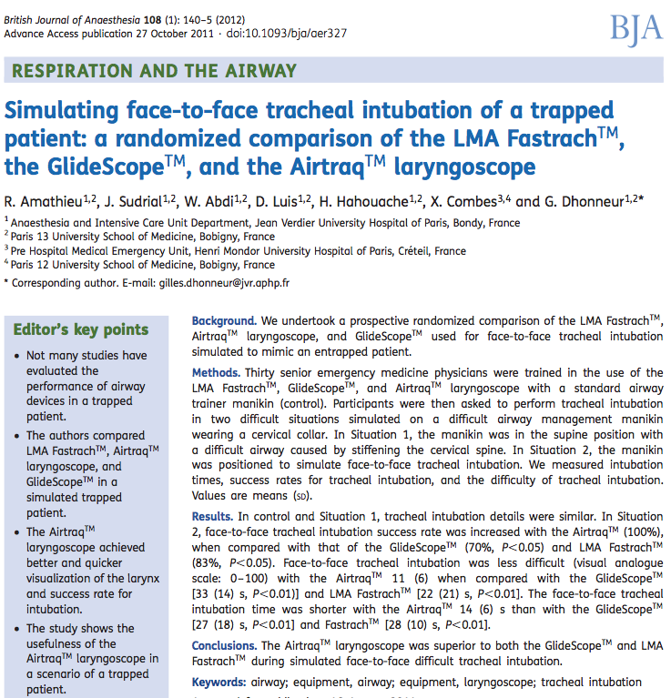 - En este artículo se compara la intubación en maniquí con vía aérea difícil simulada mediante colocación de collarín y limitación de la movilidad cervical, en dos supuestos clínicos con paciente en decúbito supino y paciente atrapado semisentado en el que se debe realizar la intubación desde la cara. Para ello se comparan tres métodos: mascarilla Fastrach, videolaringoscopio glidescope y Airtraq. Se instruyo a 30 anestesistas senior en el empleo de los distintos dispositivos y se tubo en cuanto el tiempo de intubación, la tasa de éxito y la dificultad de la intubación indicada sobre una escala analógica-visual. En el supuesto 1 (paciente en decubito supino) los datos fueron similares para los tres métodos, mientras que en el supuesto 2 (paciente atrapado, intubación semisentado), la tasa de exito fue del 100% para Airtraq comparada con 70% para Glidescope y 83% para Fastrach. El tiempo de intubación fue también más corto para Airtraq 14 seg, comparado con 27 Glidescope y 28 seg Fastrach. También fue evaluado el método con Airtraq como el más sencillo en la escala analógico visual 11, comparado con 33 Glidescope y 22 Fastrach. Concluyendo que el método con Airtraq fue superior a los otros dos en el supuesto de paciente atrapado que precisa intubación anterior.