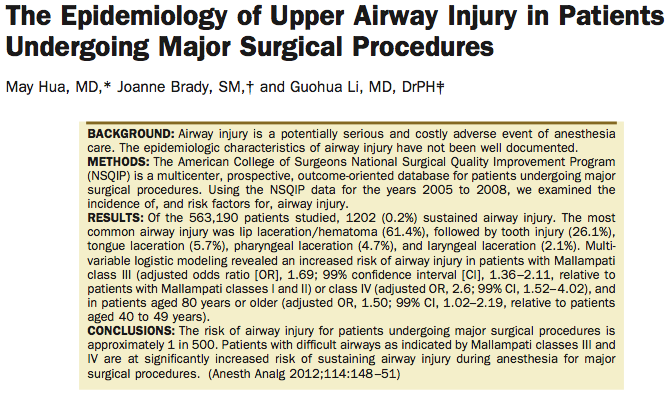 Utilizando la base de datos del Colegio Americano de Cirujanos para la mejora de la calidad (NSQIP) durante los años 2005-2008 se revisaron un total de 563.190 pacientes, de los que 1202 (2%), presentaron lesión en la vía aérea. La lesión de vía aérea más prevalente fue la laceración/hematoma de labio (61,4%), seguida de la lesion dental (26,1%), laceración de lengua (5,7%), laceración faringea (4,7%) y laceración laringea (2,1%). Se hizo una regresión logística multivariable para determinar aquellas características que conllevaban un mayor riesgo de lesión: determinando que los pacientes con Mallampati III (OR 1,69) o IV (OR 2,6), así como los pacientes de 80 años o más (OR 1,50) eran los que presentaban mayor riesgo de lesión de vía aérea.