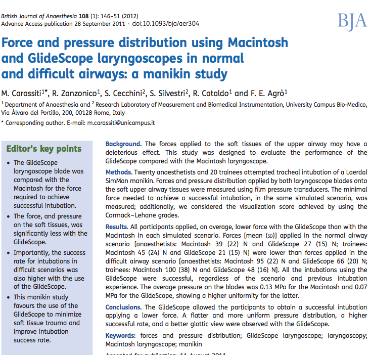 - En este artículo se compara la fuerza y distribución de la presión durante el empleo de un laringoscopio convencional con pala Macintosh y el videolaringoscopio Glidescope. Para ello se reclutaron 2 grupos de 20 participantes, el primero de ellos anestesiologos con al menos 3 años de experiencia y el segundo de anestesiologos en periodo de formación. Todos ellos utilizaron ambos métodos en tres supuestos escenarios en maniquí: paciente normal y paciente con vía aérea difícil (edema de lengua, rigidez cervical). Todos los pacientes emplearon una menor fuerza con la pala Glidescope en ambos supuestos escenarios, siendo menor la fuerza empleada en el escenario del paciente normal. La presión media de la pala del Macintosh fue de 0,13 MPa comparada con tan solo 0,07 para el Glidescope, distribuyendo una mayor uniformidad de esté último. Concluyen que el Glidescope permitió a los participantes conseguir una intubación correcta aplicando una menor fuerza. La tasa de exito fue mayor, la visión glótica mejor y la distribución de la pala menor y más uniforme con el Glidescope que con la pala Macintosh.