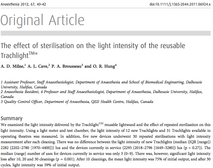 - En este artículo se pretende determinar si el uso reiterado de la varilla luminosa Trachlight y su correspondiente esterilización afectan la intensidad de luz que proporciona la varilla. Para ello compararon la intensidad luminosa de 12 varillas nuevas, con la proporcionada por las varillas luminosas que ya estaban utilizando en el servicio (31) con menos de 10 usos (número de usos recomendado por la casa comercial). No se encontraron diferencias estadísticamente significativas. En una segunda fase fueron viendo la intensidad luminosa de 5 varillas luminosas tras 10, 20 y 30 usos. Después de 10 usos determinaron una perdida de intensidad del 25%, tras 20 usos del 32% y tras 30 usos del 41%. Destacan que no está determinada la intensidad luminosa necesaria para una correcta transiluminación ya que depende de muchos factores, mientras que para los laringoscopios si está determinada siendo esta de 500 lux.