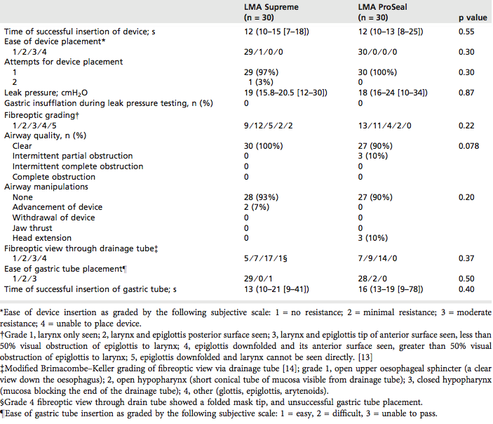 - Se realizó un estudio comparativo sobre el uso de la mascarilla laringes Supreme vs Proseal en 60 niños randomizados de forma informática.