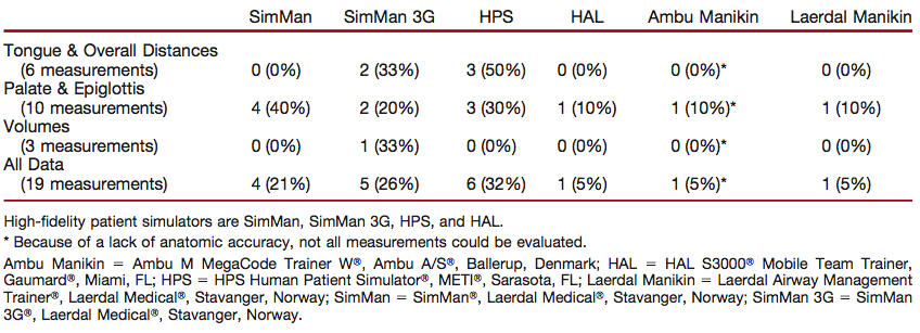 - El espacio faringe o de todos los maniquíes difería del de los humanos. El HPS (Human Patient Simulator (METI, Sarasota, FL) fue el que más se acerco a las medidas del humano, con un total de 6/19 (32%) de los parámetros evaluados correctos.
