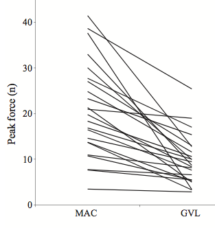 - La fuerza máxima, la fuerza media y la fuerza impulsora (integral de la fuerza ejercida por unidad de tiempo) fueron menores para el Glidescope, con una diferencia estadísticamente significativa, a pesar de que el tiempo empleado para la intubación fue mayor.