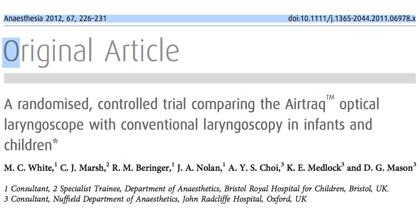- Se compararon la intubación con Airtraq en recién nacido y niños vs la intubación convencional con Macintosh. Se reclutaron un total de 20 recien nacido y 40 niños. El tiempo medio de intubación con Airtraq fue superior al de la intubación con laringoscopio convencional (47,3(32,6) vs 26,3 (11,5) segM o=0,002), aunque la diferencia solo fue significativa en niños (p=0,003) y no en recién nacidos (p=0,29). El Airtraq proporcionó una mejor visualización de la laringe según la escala POGO (100 vs 77 p=0,001). En niños la visión fue similar con ambos dispositvos (100 vs 100).