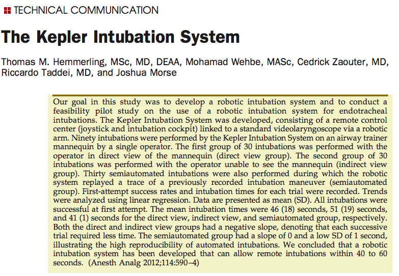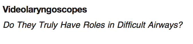 - Interesante editorial de la revista Anesthesiology en la que se trata el papel real de los videolaringoscopios en los pacientes con vía aérea difícil. Se concluye que si bien los videolaringoscopios proporcionan una mejor visión glótica y una tasas de éxito de intubación mayores que la laringoscopia convencional, todavía no hay evidencia suficiente sobre si los videolaringoscopios proporcionan menor trauma de la vía aérea, o precisan un mayor tiempo de apnea.