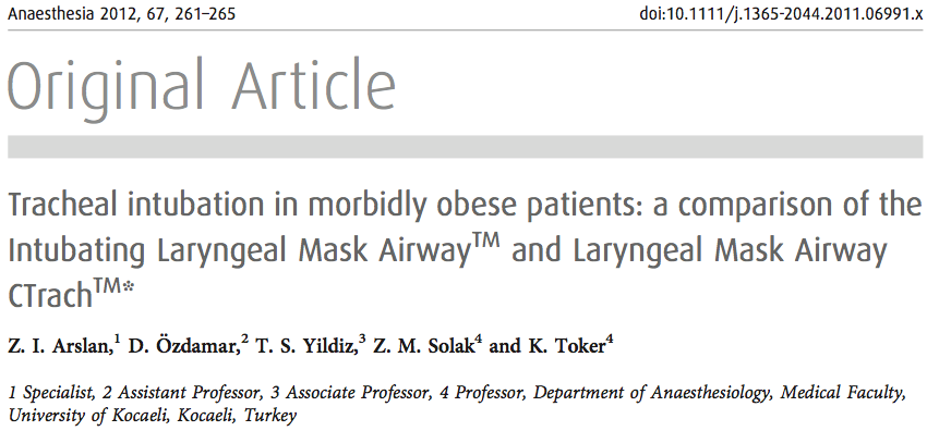 - En este estudio se compara el uso de la mascarilla laríngea de intubación FASTRACH, vs la mascarilla laríngea C-trach, en pacientes obesos con IMC> 40. Se compararon un total de 40 pacientes con cada dispositivo, determinando un tiempo para completar la intubación traqueal mayor con la C-trach (78 vs128 seg p<0,001, se precisaron mayor número de maniobras para lograr un ventilación satisfactoria y una buen visión glótica con la C-trach (25% vs 55% p0’006). Durante el periodo postoperatorio hubo mayor molestia faríngea con la C-trach p<0,02).