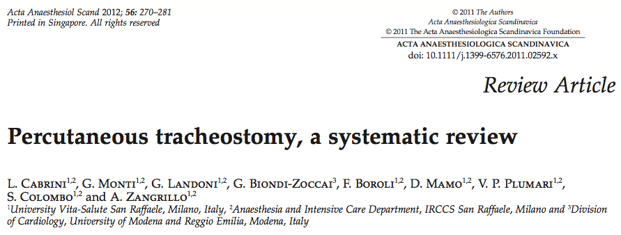 - Se realizó una revisión sistemática y meta-análisis de estudios randomizados que comparasen las distintas técnicas de traqueotomía percutánea en pacientes críticos. Se analizaron un total de 1130 pacientes en 13 estudios randomizados. Se evaluaron las siguientes técnicas: