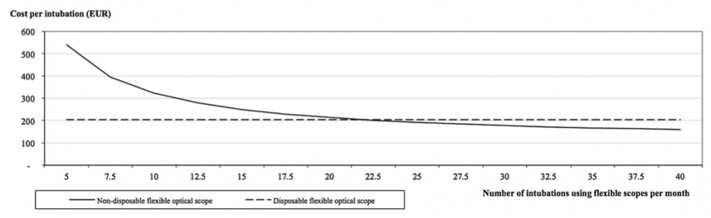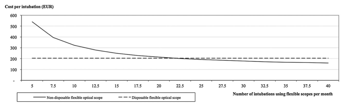 - El punto de corte en que el gasto es igual para el uso de videoscopios desechables vs fibroscopios convencionales fue cuando se realizan 22,5 intubaciones/mes.