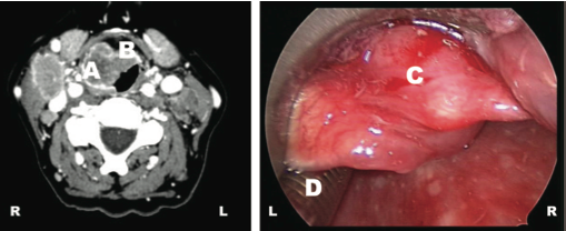 - Un CT de la región mostró una masa de 32X 26 mm que incluia el repliegue ariepiglótico derecho (A), y la base de la epiglotis (B). Tras realizar un intubación con paciente despierto mediante fibroscopio, se realizó una laringoscopia que evidencia la importante masa tumoral (C) que impide la visión de la glotis y de la porción distal del tubo endotraqueal (D).