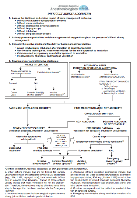 La primera guía sobre manejo de la VAD fue elaborada en 1993 por The American Society of Anaesthesiologist (ASA), posteriormente revisada en 2003, y actualizada recientemente en Febrero de 2013,aunque ésta ha sido la de más amplia difusión, han sido numerosas las Sociedades Científicas que también las han realizado su propia guía o algoritmo. Evidentemente, ello es reflejo de que no se dispone actualmente del documento ideal. Esta proliferación de guías es fruto de la necesidad de adaptación de las estrategias según los recursos humanos y materiales de cada centro, y sobre todo a la experiencia personal de los anestesiólogos. Sin embargo, aunque la mayoría difiere tanto en el diseño como en las situaciones clínicas que plantean, revisados en profundidad, pueden encontrarse unos principios básicos de actuación comunes: