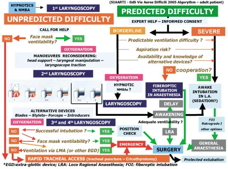 El grupo de estudio de Vía Aérea de la Sociedad Italiana de Anestesiología y reanimación publicó en 1995, su guía de manejo global de vía aérea. Esta guía se presenta como una referencia muy completa de manejo del paciente general y se divide en distintos apartados: