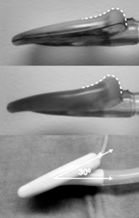 Superior: air-Q® en su versión original. Medio: versión nueva de air-Q®. El “talón” posterior de la mascarilla está señalado con líneas discontinuas blancas. Nótese el incremento de altura del manguito en su porción posterior con el nuevo dispositivo. Hay un ángulo de 0º entre el tubo de inserción en la vía aérea y la mascarilla. Esto contrasta con el ángulo de 30º presente en la Mascarilla Laríngea Clásica (Inferior).