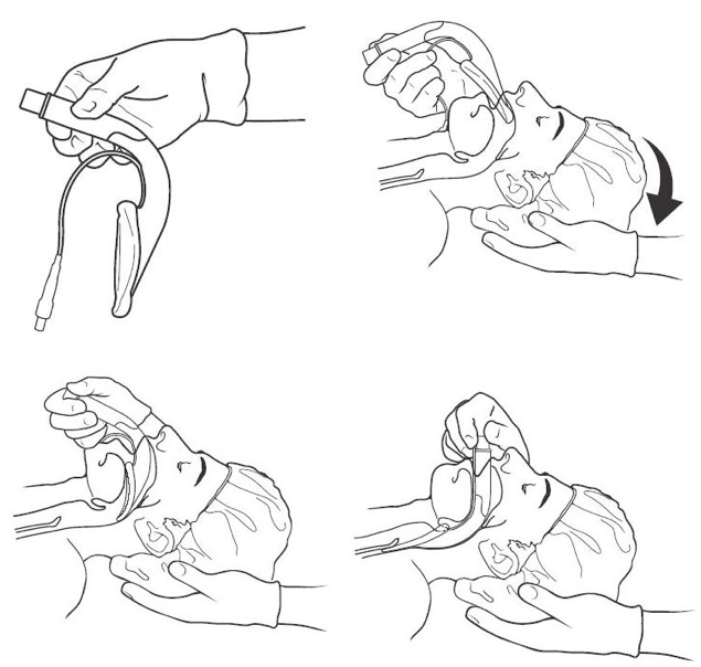 - Cuando la punta del manguito está correctamente colocada en la abertura de la boca, continuar el movimiento haciendo girar la mascarilla hacia adentro con un movimiento circular, presionando los contornos de la bóveda y el velo del paladar.
