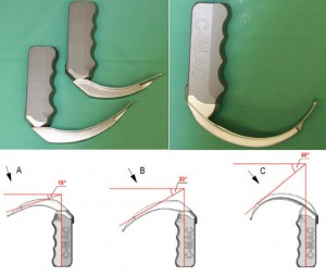 • 3 Macintosh ( Nº 2, 3, 4): Presentan el mismo diseño que la pala clásica de Macintosh lo que facilita la técnica por personal entrenado en laringoscopia directa. La angulación de la pala es de 18◦ en la nº3 y de 30◦ en la nº4, lo cual nos da un ángulo de visión anterior de 16◦ con la nº3 y de 20◦ con la nº4.